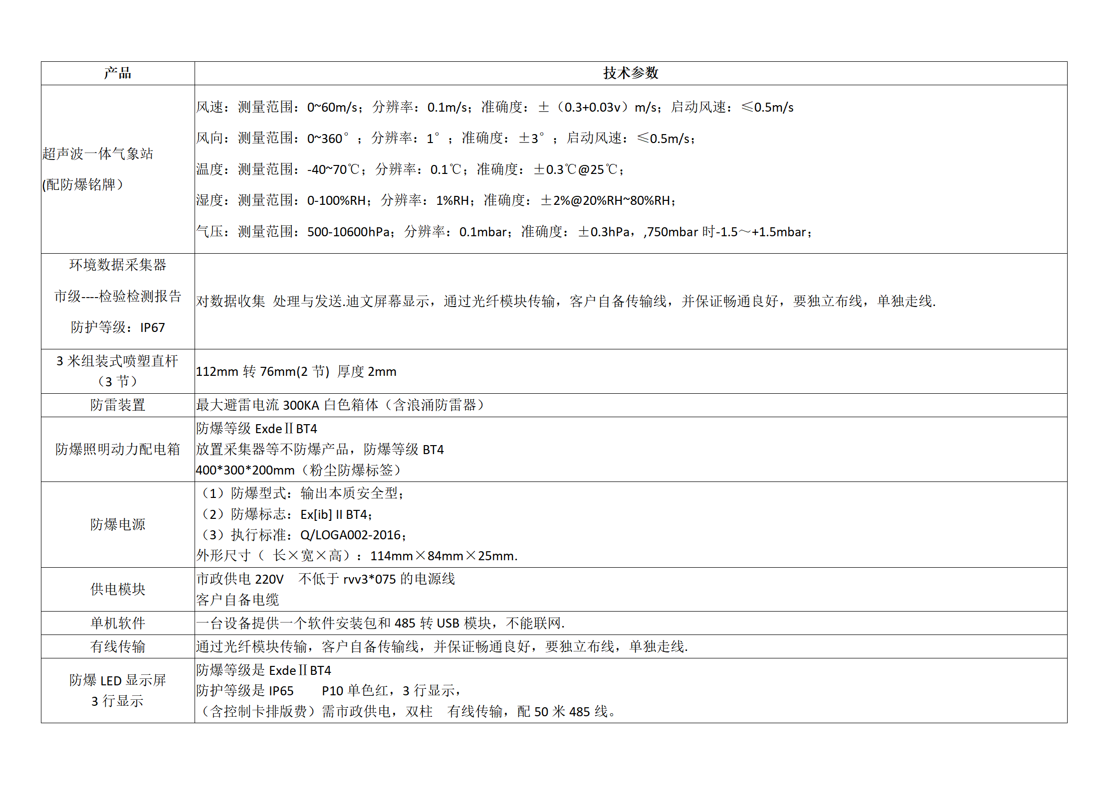 防爆超聲波監(jiān)測(cè)系統(tǒng)是     物聯(lián)網(wǎng)一體化的多要素超聲波氣象監(jiān)測(cè)傳感器,包括N個(gè)超聲波氣象傳感器,和與超聲波氣象傳感器無(wú)線通信的后臺(tái)服務(wù)器;超聲波氣象傳感器包括中央處理器,分別與中央處理器的輸入端連接的溫度采集傳感器、濕度采集傳感器、風(fēng)速采集傳感器、風(fēng)向采集傳感器、氣壓采集傳感器、雨量采集傳感器,以及輸出端與中央處理器的電源端連接的蓄電池,輸出端與蓄電池的輸入端連接的太陽(yáng)能電池板;中央處理器設(shè)有無(wú)線通信接口,通過(guò)無(wú)線通信模塊與后臺(tái)服務(wù)器無(wú)線通信。本實(shí)用新型集超聲波氣象數(shù)據(jù)采集、中央數(shù)據(jù)處理、4G無(wú)線通信、太陽(yáng)能供電、后臺(tái)服務(wù)器為一體,監(jiān)測(cè)全面、結(jié)構(gòu)簡(jiǎn)單、功能高度集成化、現(xiàn)場(chǎng)應(yīng)用操作簡(jiǎn)便、后期免維護(hù)。