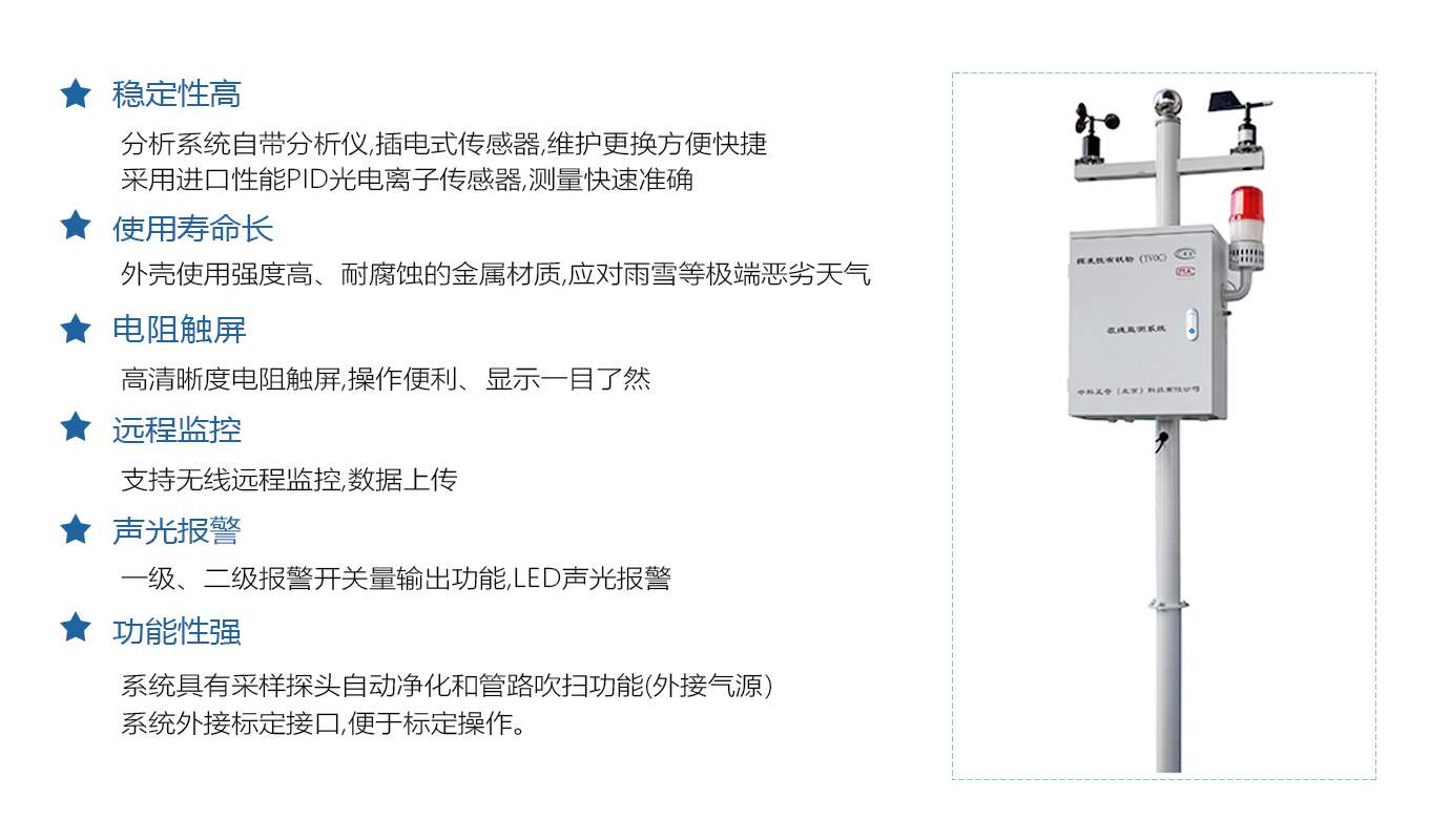 揮發(fā)性有機(jī)物在線監(jiān)測系統(tǒng)是多種揮發(fā)性有機(jī)化合物的總稱,采用獨(dú)創(chuàng)的核心算法,實(shí)現(xiàn)分辨率1ppb的高精度檢測,可達(dá)國控站監(jiān)測指標(biāo),同時(shí)該設(shè)備獲得CCEP中環(huán)協(xié)認(rèn)證證書 ,系統(tǒng)采用特殊方法采樣,氣體經(jīng)過降溫、干燥、過濾預(yù)處理,再通過PID變送器測得氣體的VOC的濃度,另外還配置智能報(bào)警燈,當(dāng)VOC濃度值超過設(shè)置閾值,自動(dòng)啟動(dòng)報(bào)警裝置,采用模塊化結(jié)構(gòu),安裝、操作方便。