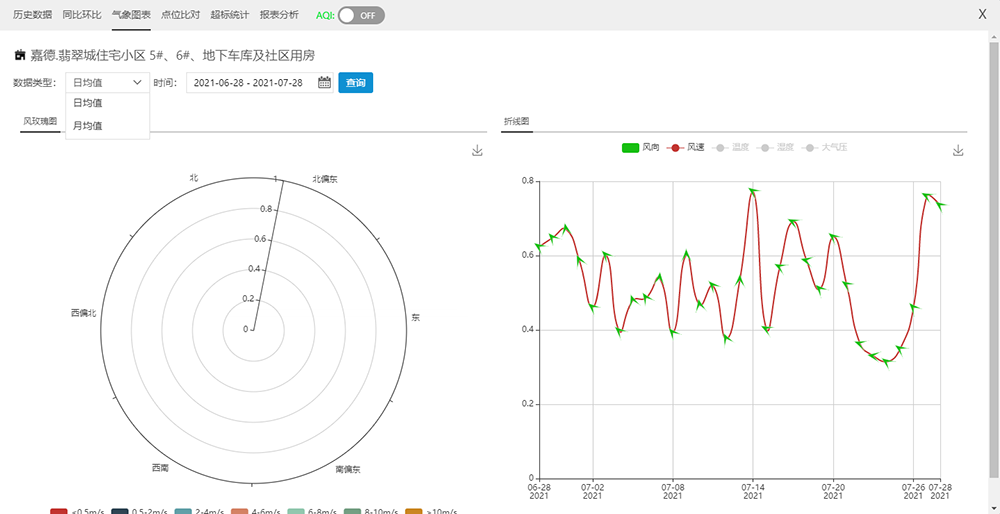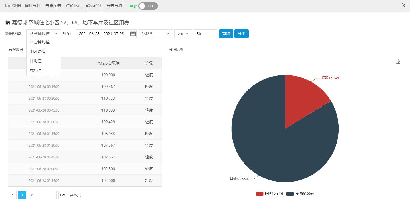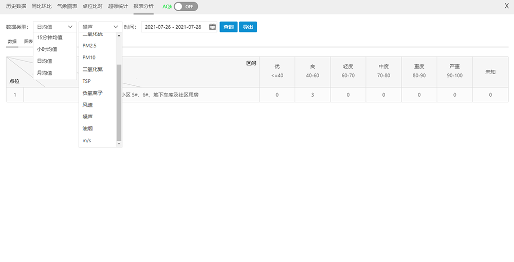 對特定點位選定時間段進行超標(biāo)統(tǒng)計,以表和圖兩種方式同時顯示,通過圖可以直觀看到超標(biāo)的情況,通過表可以詳細(xì)看到具體超標(biāo)時間