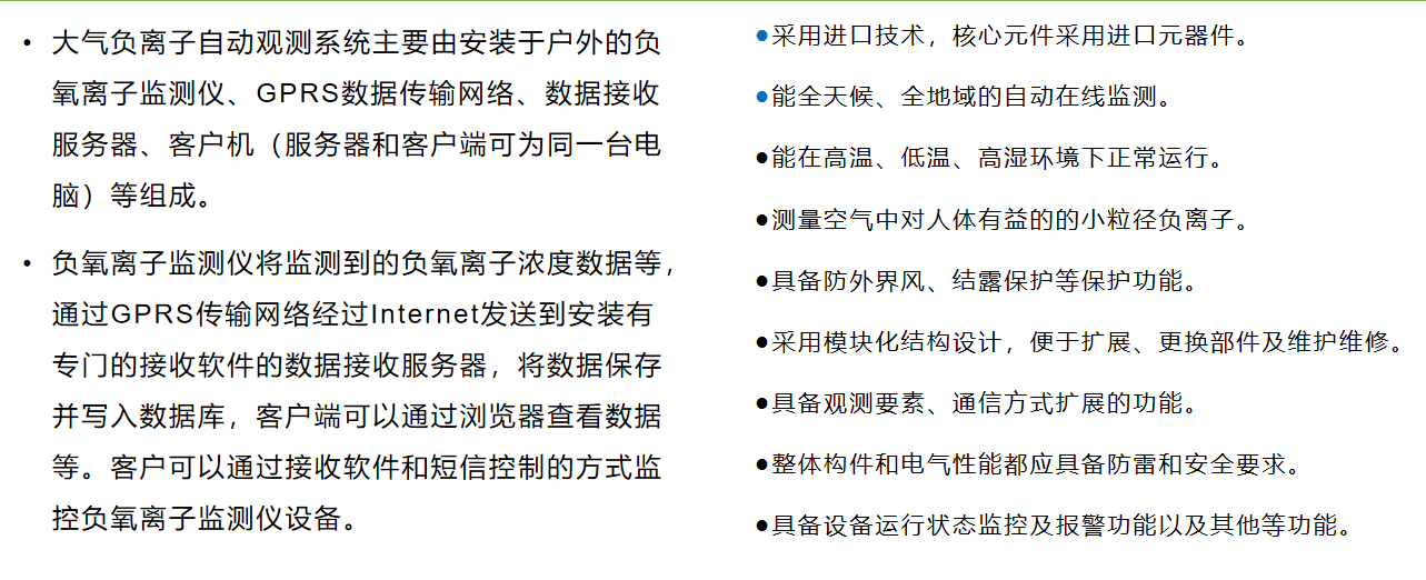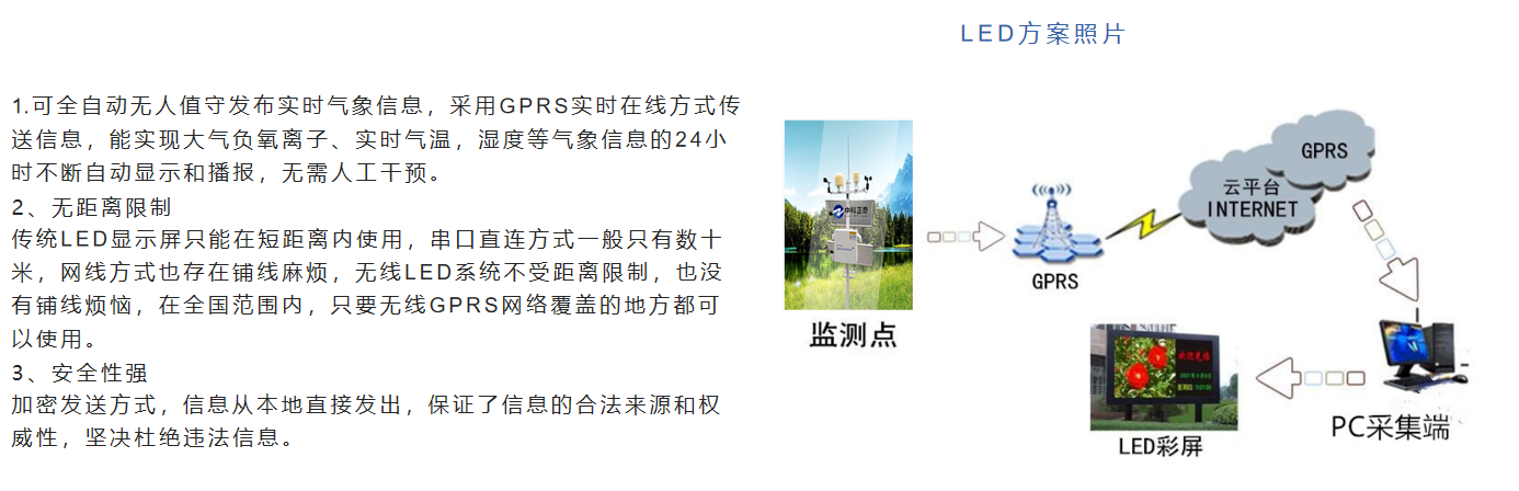 可對負(fù)氧離子、溫濕度進行監(jiān)測, 并可根據(jù)客戶需求增加P M 2 . 5 、 P M 1 0 、噪聲、臭氧、二氧化氮、二氧化硫、一氧化碳、風(fēng)速、風(fēng)向 等等監(jiān)測項目, 充分滿足環(huán)保局、旅游局對環(huán)境監(jiān)測需要。