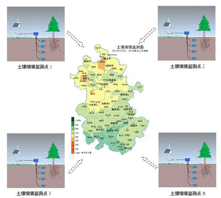土壤墑情自動監(jiān)測站能夠?qū)崿F(xiàn)對土壤墑情(土壤濕度)的長時間連續(xù)監(jiān)測。用戶可以根據(jù)監(jiān)測需要,靈活布置土壤水分傳感器;也可將傳感器布置在不同的深度,測量剖面土壤水分情況。系統(tǒng)還提供了額外的擴展能力,可根據(jù)監(jiān)測需求增加對應傳感器,監(jiān)測土壤溫度、土壤電導率、土壤PH值、地下水水位、地下水水質(zhì)以及空氣溫度、空氣濕度、光照強度、風速風向、雨量等信息,從而滿足系統(tǒng)功能升級的需要。