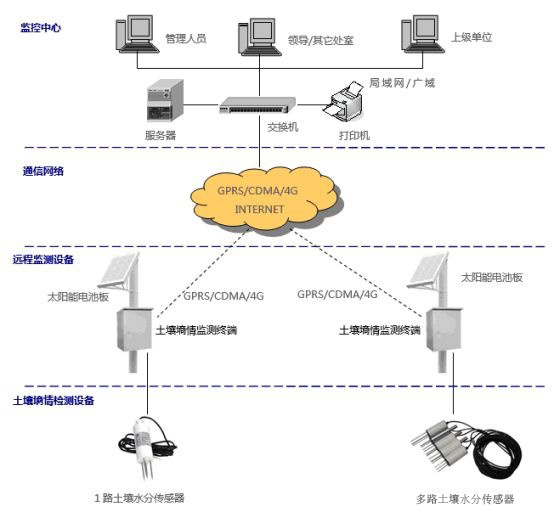 土壤墑情監(jiān)測系統(tǒng)主要由監(jiān)控中心、通信網(wǎng)絡、遠程監(jiān)測設備和土壤墑情檢測設備四部分構(gòu)成。