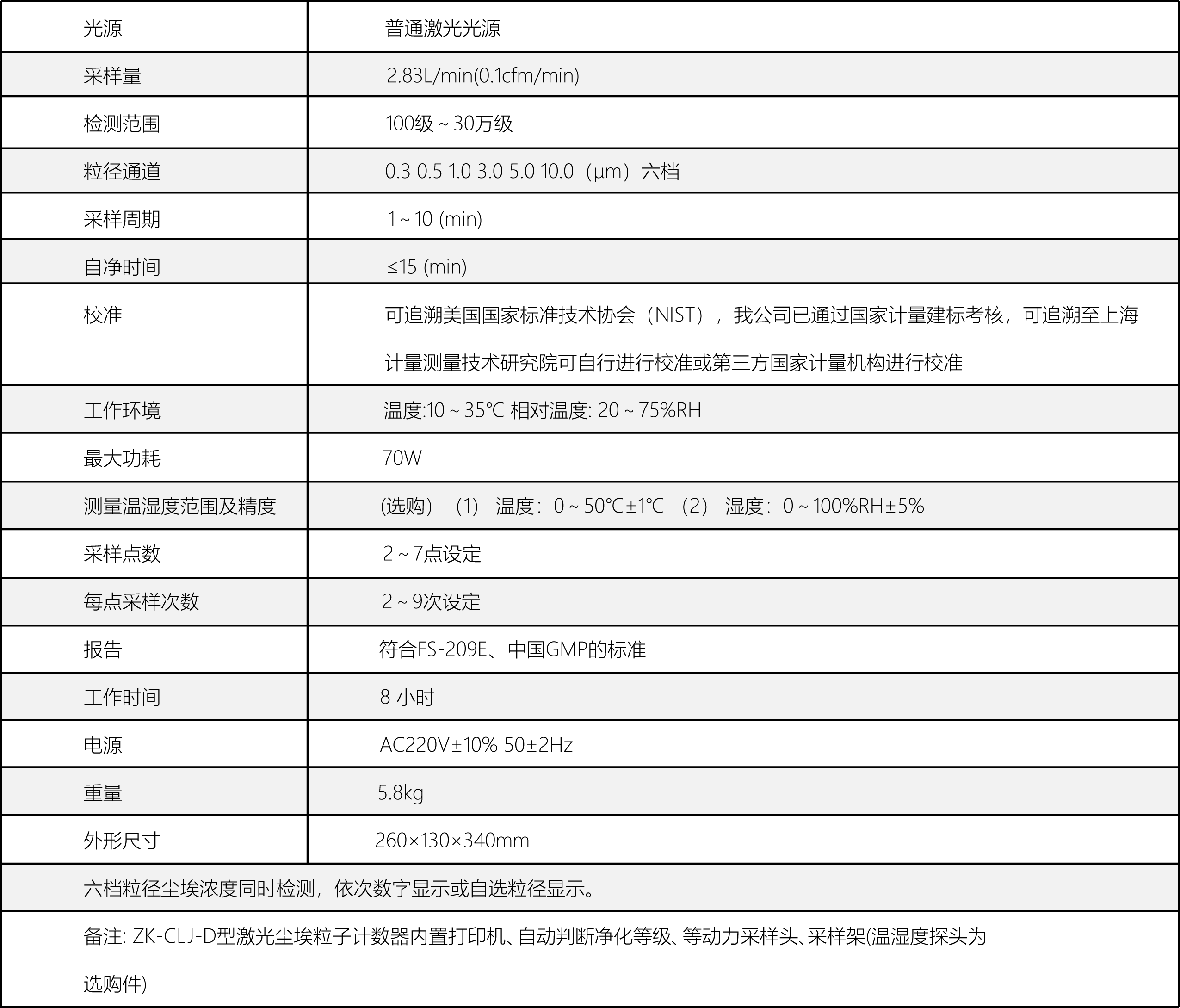 ZK-CLJ-D型激光塵埃粒子計(jì)數(shù)器的技術(shù)指標(biāo)均滿足國(guó)家計(jì)量總局頒布的JJF1190-2008檢定規(guī)程的要求,整機(jī)功能采用美國(guó)微電腦控制處理技術(shù)及國(guó)際上最先進(jìn)的SMT芯片貼片封裝技術(shù)和優(yōu)質(zhì)傳感器及氣泵,可直接打印檢測(cè)結(jié)果。設(shè)備一次采樣可同時(shí)測(cè)得多種粒徑的塵埃粒子數(shù),并能選擇觀察其中某一粒徑粒子的數(shù)目及其變化情況,對(duì)于研究、檢測(cè)和評(píng)價(jià)各種潔凈環(huán)境都十分方便。