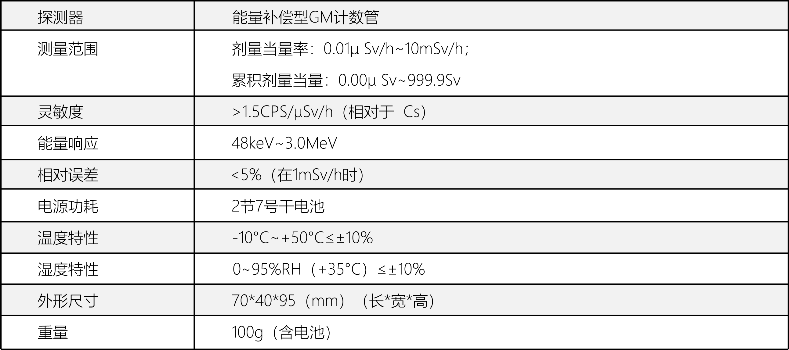 ZK-RG1100型放射性個(gè)人劑量報(bào)警儀是一款小型高靈敏度的個(gè)人輻射劑量報(bào)警儀。該儀器采用G-M計(jì)數(shù)管作為探測(cè)器,反應(yīng)速度快。主要用來監(jiān)測(cè)X射線和γ射線,在測(cè)量范圍內(nèi),可任意設(shè)定報(bào)警閾值,當(dāng)達(dá)到報(bào)警閾值時(shí),發(fā)出警報(bào)及時(shí)提醒工作人員注意安全。儀器主要技術(shù)指標(biāo)符合國(guó)家標(biāo)準(zhǔn)和國(guó)際標(biāo)準(zhǔn),是目前國(guó)內(nèi)同類儀器中功能強(qiáng)、體積小、功耗低的佩戴式袖珍儀器。